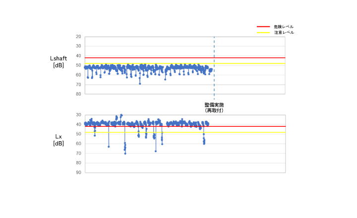変速機の回転周波数成分へのLxが顕著に悪化していたが、Lshaftも悪化していた。これは変速機の状態変化がモータの回転にも影響を及ぼしていたものと考えられる。
